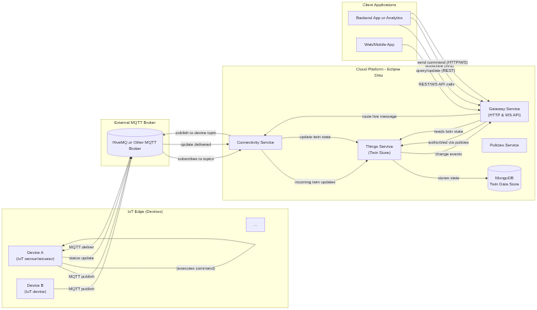 In this architecture, devices (Device A, B, …) publish telemetry to an MQTT broker. Ditto’s Connectivity service maintains a connection to that broker (subscribing to relevant topics) and thus receives device messages. The Things service updates the corresponding digital twin’s state in MongoDB, and any subscribed application clients are notified of the change (through the Gateway’s WebSocket/HTTP API). Conversely, an application can send a command via HTTP or WebSocket to the twin (through the Gateway). Ditto (Connectivity service) will publish that command to the broker on a topic the device is subscribed to, allowing the physical device to receive and act on it. Throughout, Policies ensure only authorized actions occur. This setup can scale horizontally – e.g., multiple instances of Things service and Connectivity service can be run to handle more load, since the architecture is modular and message-driven.